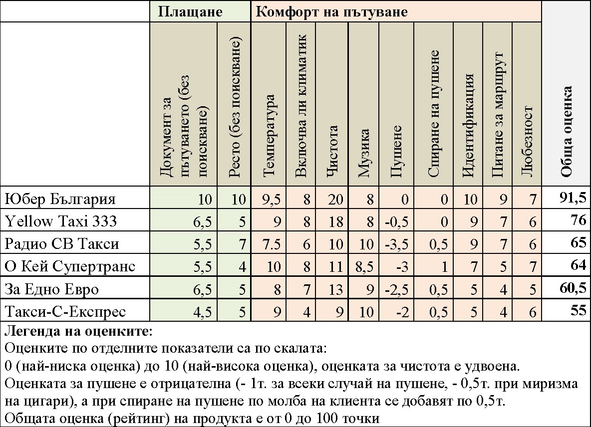 В проучването са обхванати: 5-те най-големи таксиметрови компании обслужващи София (О Кей Супертранс, Такси-C-Експрес, За Едно Евро, Yellow Taxi 333, Радио СВ Такси) и една платформа за споделено пътуване (Юбер България).