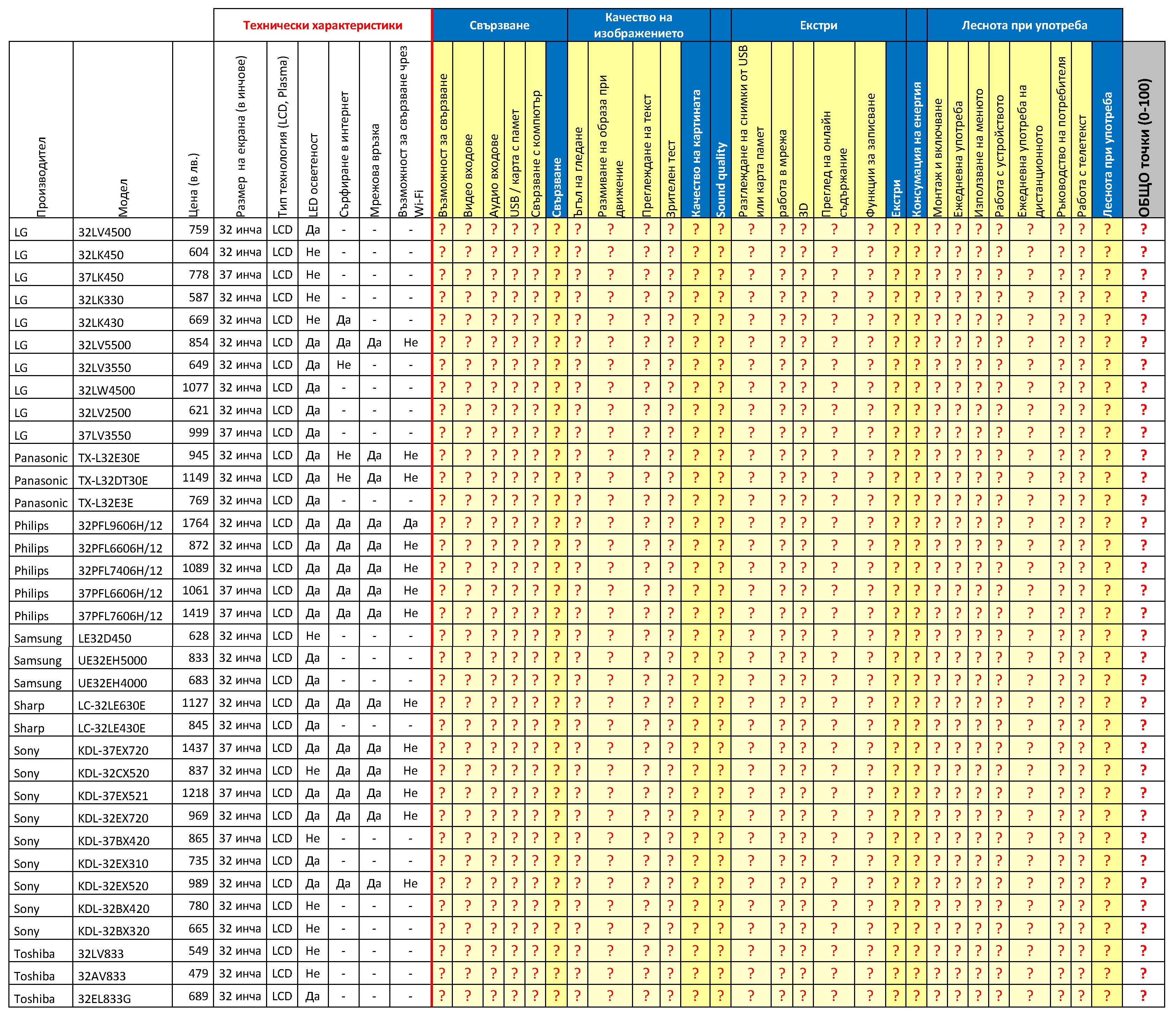 Технически характерисики - включена е информация за основните технически характеристики: големина на екрана, тип на екрана, LED осветеност, сърфиране в интернет, мрежова връзка, възможност за свързване с Wi-Fi.