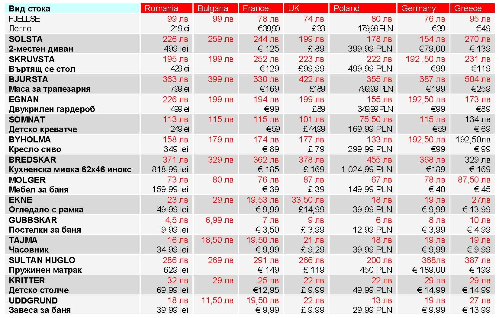 От съпоставката се вижда, че при част от стоките като - легло модел FJELLSE, 2-местен диван SOLSTA и маса за трапезария BJURSTA, цените са сред от най-високите именно в България в сравнение с останалите страни. При други артикули - кухненска мивка BREDSKAR и завеса за баня UDDGRUND цените в българия са сравнително ниски за пазара.